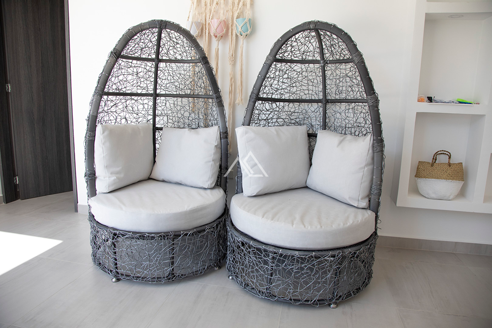 Si se quiere dar un concepto diferente a cualquier espacio pero a la vez comodo y llamativo las sillas Mykonos son ideales para esos sitios donde queremos impresionar , son llamativas donde se coloquen, en la piscina en el recibidor en la sala o en las terrazas su asiento es amplio y comodo el espaldar es bastante acogedor. ideal para habitaciones como silla para leer . su delicado tejido en el espaldar la hacen aun mas llamativa y especial. Estructura en aluminio y tejido en resina sintetica redondeada. textiles en lonas aptas para exteriores 70 % impermeables.